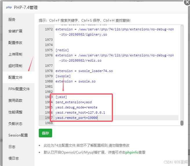 3.成功之后记得修改php.ini,改完之后重载配置文件打开宝塔对应 PHP 版本的 php.ini 配置文件,在文件末尾添加 yasd 扩展的加载指令。需要设置 yasd 为远程调试模式,配置调试服务器监听的 IP 地址和端口号(通常使用 19000 端口)。还需要设置相关的调试参数,如日志级别、断点文件路径等。配置完成后,需要在宝塔面板中重载 PHP 配置,或者通过命令行重启 PHP-FPM 服务使配置生效。