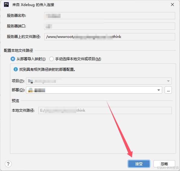 3.设置xdebug信息进入 PHPStorm 的调试设置,选择 DBGp Proxy 作为调试器类型。设置 IDE 密钥(可以自定义),主机填写本地机器 IP,端口设置为 19000。配置路径映射,这里要特别注意,映射关系必须正确,否则断点无法命中。还可以设置最大连接数、超时时间等高级选项。