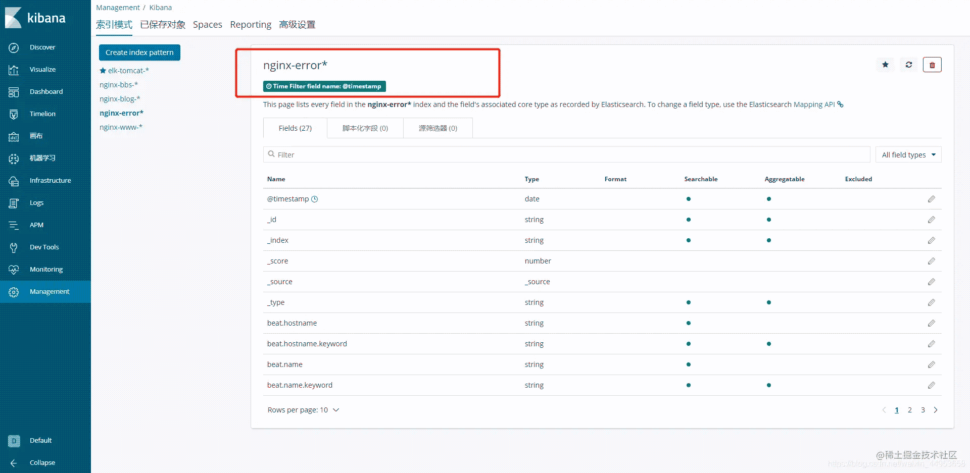 3.在kibana上关联es索引点击Managerment---索引模式---创建索引