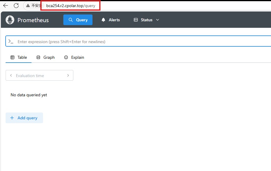 最后,我们使用固定的公网地址在任意设备的浏览器中访问,可以看到成功访问本地部署的prometheus页面,这样一个永久不会变化的二级子域名公网网址即设置好了。