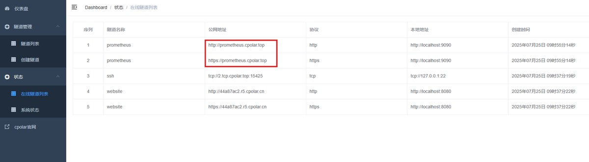 服务器就像我们的数字工厂,时刻运转却怕出故障。Prometheus作为开源监控神器,能帮你盯紧每一个指标,但默认只能在机房查看。要是半夜服务器报警,还得跑回公司处理?别慌,cpolar内网穿透来救场!今天就教你如何把Prometheus监控面板“搬”到手机上,随时随地掌握服务器健康状态,运维从此告别“办公室绑定”????。 Prometheus的核心功能好比给服务器装了“体检仪”,CPU、内存、磁盘占用等数据实时更新,还能自定义告警规则。它特别适合运维人员和技术团队,尤其是中小型企业,毕竟免费开源,省下的预算够买好几杯咖啡了?。优点嘛,数据采集精准,搭配Grafana可视化超直观,而且生态丰富,插件众多,几乎能监控你能想到的所有服务。 用Prometheus半年,最大的感受是“早用早香”!刚开始觉得配置告警规则有点复杂,后来发现官网模板很多,复制粘贴改改参数就行。日常使用中,最爽的是能自定义仪表盘,把关键指标拖到首页,一眼看清服务器状态。不过提醒新手朋友,数据保留策略要设好,不然硬盘很快就满了,建议按需求保留7-15天数据足够。 虽说Prometheus功能强大,但局域网限制真的让人抓狂。有次周末在家休息,客户突然说网站打不开,我只能远程指导同事去机房看监控,沟通半天还没说清问题在哪????。而且团队成员分散各地时,想共享监控数据得用VPN,延迟高还不稳定,远程协作效率大打折扣。 直到给Prometheus配上cpolar,才算真正解放了运维!现在不管在哪,打开手机就能看监控面板,数据实时同步不卡顿。最牛的是cpolar支持HTTPS加密,远程访问比VPN还安全,老板再也不用担心数据泄露了。前几天出差在外,服务器内存飙升告警,我通过手机监控定位到是某个服务异常,远程重启就搞定,省去了来回奔波的麻烦。 下面就开始我们的安装流程! 1.安装prometheus通过以下命令创建一个用于存放 Prometheus 的目录 /app: