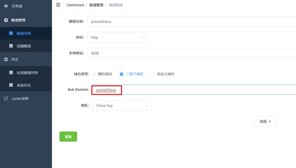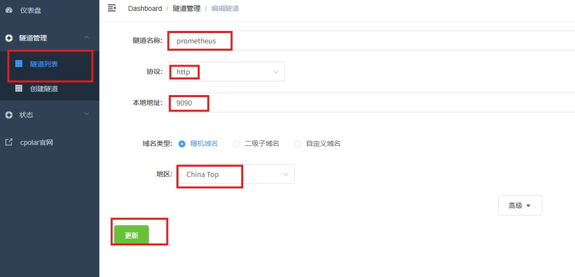 登录cpolar web UI管理界面,点击左侧仪表盘的隧道管理——隧道列表,找到所要配置的隧道prometheus,点击右侧的编辑。