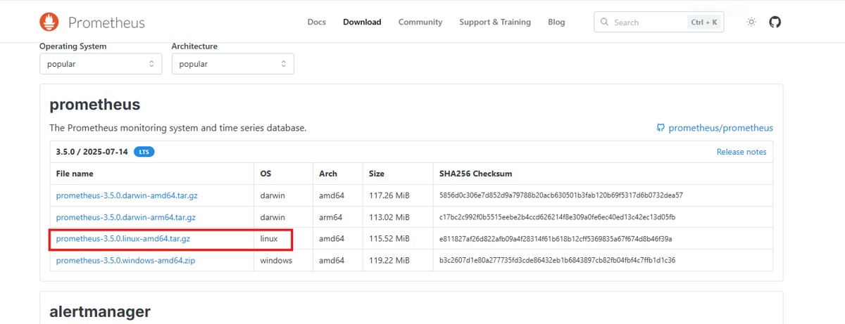 从prometheus官网下载压缩文件:https://prometheus.io/download/ 下载适用于Linux系统的文件。