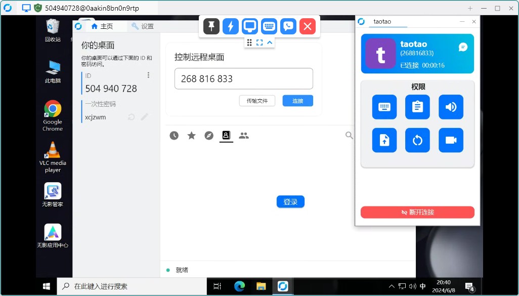 示例: 笔记本 和 无影云电脑 都安装了 RustDesk for Win 客户端,并且 ID/中继服务器 均配置完成。笔记本获取无影电脑的 ID 值和密码,连接成功。