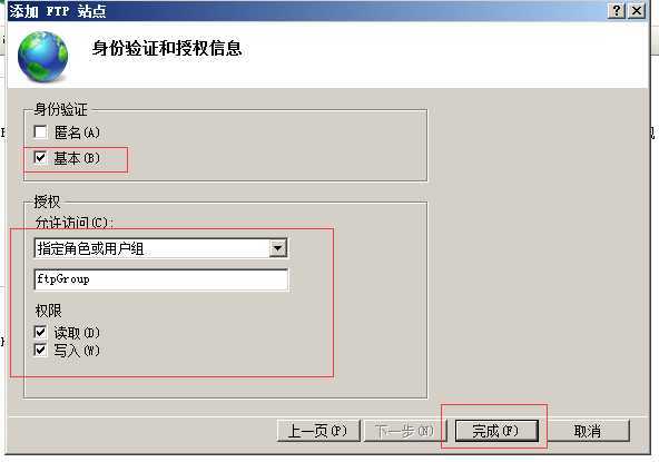 身份验证选择基本 授权选择指定角色或用户组 ftpGroup (这里使用我们第一步创建的ftp分组) 权限(读写权限)