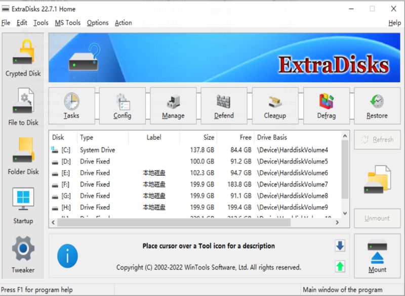 ExtraDisks是一款专为Windows系统设计的虚拟磁盘创建和管理工具,支持加密、虚拟磁盘挂载等功能,适用于数据安全存储和系统优化。它允许用户在硬盘上创建加密的虚拟磁盘,这些虚拟磁盘如同真实的物理磁盘一样工作,但提供了更高级别的安全性和隐私保护。ExtraDisks 使用行业标准的加密算法,确保您的敏感数据安全无虞。它操作简便,无需复杂的配置,即可轻松创建和管理多个虚拟磁盘。