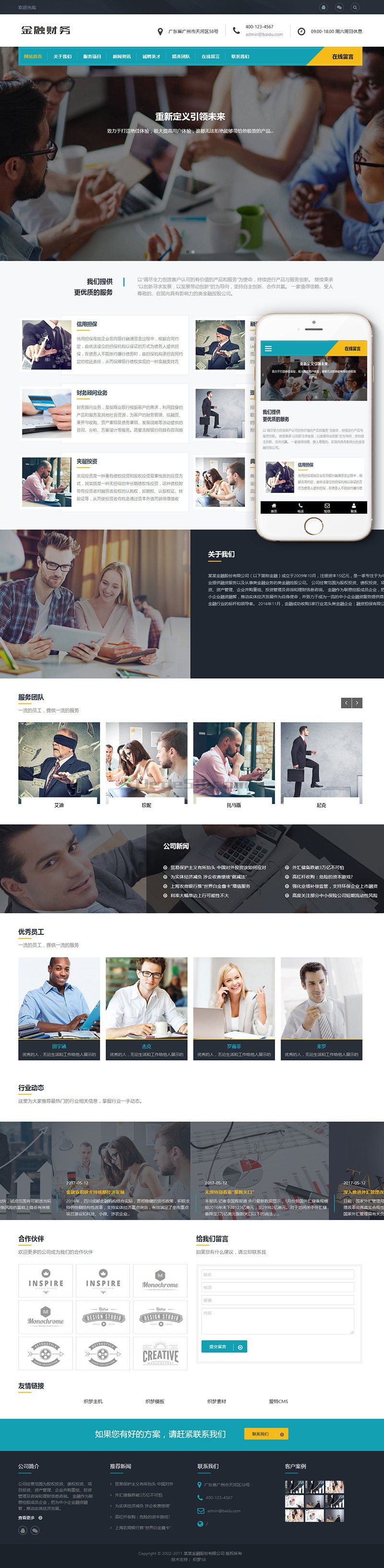织梦最新内核开发的模板,该模板属于企业通用、HTML5响应式、信用担保、融资租赁、财务顾问业务、理财咨询、典当服务类企业使用,一款适用性很强的模板,基本可以适合各行业的企业网站!响应式自适应各种移动设备,同一个后台,数据即时同步,简单适用!